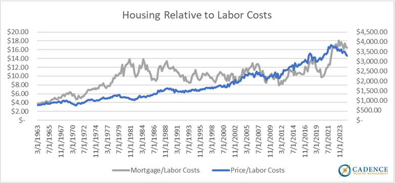 (The chart below shows housing prices and borrowing costs relative to unit labor costs, which approximates the rise in labor income over time. This relationship is intended to exclude those at the top of the income strata whose total compensations have risen more in line with asset markets, and looks at more median income levels; aka the average American).