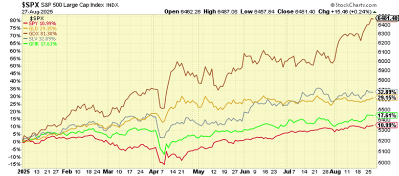 Even though the stock market is still up, it’s starting to underperform a handful of alternative asset categories that typically underperform the indexes in strong economic and financial market environments – namely gold, silver, and the companies that mine them. To a lesser extent, a broad mix of natural resource stocks are also outperforming the major tech-led indexes. This could be an indication that money is already starting to flow out of historically expensive tech stocks and into historically inexpensive natural resource stocks, with a preference for those that are most protective through turbulent times; gold and related categories. While most are still obsessed with artificial intelligence (AI) and the companies that deal in it, the smart money might already be moving on. The chart below, showing year-to-date performance of the categories mentioned, shows pretty clearly where investor preferences have been. In our opinion, given the state of the world, where we are in cycles, and relative valuations across the asset spectrum, this performance gap is likely just getting started. For those anticipating this shift, it’s been a great year so far.