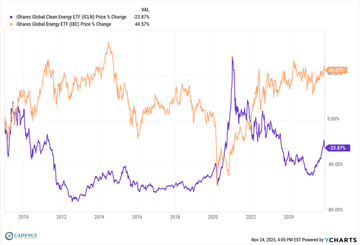What’s important to note is that this narrative, although deflating in real time, isn’t finished just yet. The clean energy ETF (ICLN) shown in the chart to the left, still has a price to sales ratio of 5.7 and a price to book ratio of 6.2 compared to those of the traditional energy ETF (IXC) at 2 and 2.2 respectively. Put simply, the clean energy investment portfolio is still priced almost 3 times more expensively than a traditional energy fund, in large part due to the lingering narrative around clean energy playing a much bigger role in the future than it does now. It’s worth noting that in addition to price performance being better over the last 16 years for traditional energy stocks (IXC), they also continue to pay a dividend that’s more than 2x that of the clean energy ETF (ICLN), at 3.6% versus 1.6%.